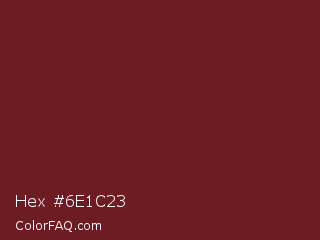 Hex #6e1c23 Color is a dark red color and the nearest color is Persian Plum #701c1c. Hex code #6e1c23 and RGB value is rgb(110,28,35). In RGB color space, this color is composed of 43% red, 11% green, 14% blue, In CMYK color space, this color is composed of 0% cyan, 75% magenta, 68% yellow , 57% black , In HSL color space, this color has a hue angle of 355° , 59% saturation and 27% lightness.