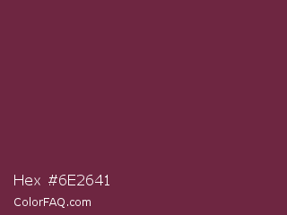 Hex #6e2641 Color is a dark rose color and the nearest color is Tawny Port #692545. Hex code #6e2641 and RGB value is rgb(110,38,65). In RGB color space, this color is composed of 43% red, 15% green, 25% blue, In CMYK color space, this color is composed of 0% cyan, 65% magenta, 41% yellow , 57% black , In HSL color space, this color has a hue angle of 338° , 49% saturation and 29% lightness.