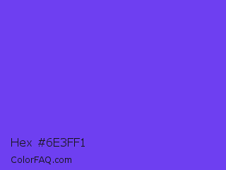 Hex #6e3ff1 Color is a normal indigo color and the nearest color is Majorelle Blue #6050dc. Hex code #6e3ff1 and RGB value is rgb(110,63,241). In RGB color space, this color is composed of 43% red, 25% green, 95% blue, In CMYK color space, this color is composed of 54% cyan, 74% magenta, 0% yellow , 5% black , In HSL color space, this color has a hue angle of 256° , 86% saturation and 60% lightness.
