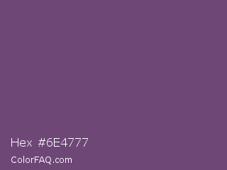 Hex #6e4777 Color is a normal purple color and the nearest color is Maximum Purple #733380. Hex code #6e4777 and RGB value is rgb(110,71,119). In RGB color space, this color is composed of 43% red, 28% green, 47% blue, In CMYK color space, this color is composed of 8% cyan, 40% magenta, 0% yellow , 53% black , In HSL color space, this color has a hue angle of 289° , 25% saturation and 37% lightness.