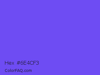 Hex #6e4cf3 Color is a light indigo color and the nearest color is Majorelle Blue #6050dc. Hex code #6e4cf3 and RGB value is rgb(110,76,243). In RGB color space, this color is composed of 43% red, 30% green, 95% blue, In CMYK color space, this color is composed of 55% cyan, 69% magenta, 0% yellow , 5% black , In HSL color space, this color has a hue angle of 252° , 87% saturation and 63% lightness.