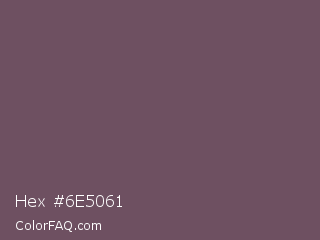 Hex #6e5061 Color is a normal magenta color and the nearest color is Zambezi #685558. Hex code #6e5061 and RGB value is rgb(110,80,97). In RGB color space, this color is composed of 43% red, 31% green, 38% blue, In CMYK color space, this color is composed of 0% cyan, 27% magenta, 12% yellow , 57% black , In HSL color space, this color has a hue angle of 326° , 16% saturation and 37% lightness.