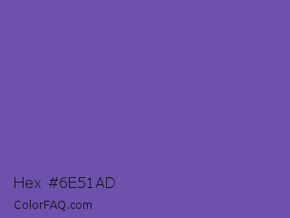 Hex #6e51ad Color is a normal indigo color and the nearest color is Studio #714ab2. Hex code #6e51ad and RGB value is rgb(110,81,173). In RGB color space, this color is composed of 43% red, 32% green, 68% blue, In CMYK color space, this color is composed of 36% cyan, 53% magenta, 0% yellow , 32% black , In HSL color space, this color has a hue angle of 259° , 36% saturation and 50% lightness.