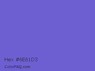 Hex #6e61d3 Color is a normal indigo color and the nearest color is Slate Blue #6a5acd. Hex code #6e61d3 and RGB value is rgb(110,97,211). In RGB color space, this color is composed of 43% red, 38% green, 83% blue, In CMYK color space, this color is composed of 48% cyan, 54% magenta, 0% yellow , 17% black , In HSL color space, this color has a hue angle of 247° , 56% saturation and 60% lightness.
