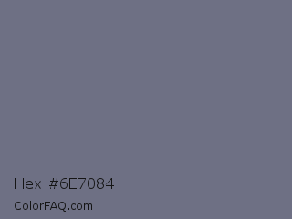 Hex #6e7084 Color is a normal blue color and the nearest color is Storm Gray #717486. Hex code #6e7084 and RGB value is rgb(110,112,132). In RGB color space, this color is composed of 43% red, 44% green, 52% blue, In CMYK color space, this color is composed of 17% cyan, 15% magenta, 0% yellow , 48% black , In HSL color space, this color has a hue angle of 235° , 9% saturation and 47% lightness.