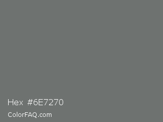 Hex #6e7270 Color is a normal green color and the nearest color is Nickel #727472. Hex code #6e7270 and RGB value is rgb(110,114,112). In RGB color space, this color is composed of 43% red, 45% green, 44% blue, In CMYK color space, this color is composed of 4% cyan, 0% magenta, 2% yellow , 55% black , In HSL color space, this color has a hue angle of 150° , 2% saturation and 44% lightness.