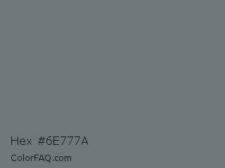 Hex #6e777a Color is a normal blue color and the nearest color is Sonic Silver #757575. Hex code #6e777a and RGB value is rgb(110,119,122). In RGB color space, this color is composed of 43% red, 47% green, 48% blue, In CMYK color space, this color is composed of 10% cyan, 2% magenta, 0% yellow , 52% black , In HSL color space, this color has a hue angle of 195° , 5% saturation and 45% lightness.