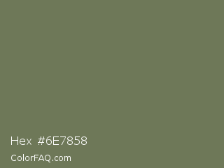 Hex #6e7858 Color is a normal lime color and the nearest color is Willow Grove #65745d. Hex code #6e7858 and RGB value is rgb(110,120,88). In RGB color space, this color is composed of 43% red, 47% green, 35% blue, In CMYK color space, this color is composed of 8% cyan, 0% magenta, 27% yellow , 53% black , In HSL color space, this color has a hue angle of 79° , 15% saturation and 41% lightness.