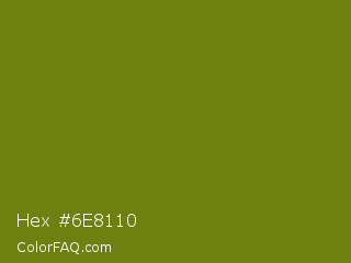 Hex #6e8110 Color is a dark yellow color and the nearest color is Pacifika #778120. Hex code #6e8110 and RGB value is rgb(110,129,16). In RGB color space, this color is composed of 43% red, 51% green, 6% blue, In CMYK color space, this color is composed of 15% cyan, 0% magenta, 88% yellow , 49% black , In HSL color space, this color has a hue angle of 70° , 78% saturation and 28% lightness.