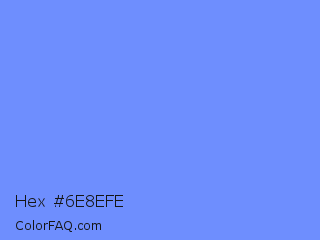 Hex #6e8efe Color is a light blue color and the nearest color is Cornflower Blue #6495ed. Hex code #6e8efe and RGB value is rgb(110,142,254). In RGB color space, this color is composed of 43% red, 56% green, 100% blue, In CMYK color space, this color is composed of 57% cyan, 44% magenta, 0% yellow , 0% black , In HSL color space, this color has a hue angle of 227° , 99% saturation and 71% lightness.