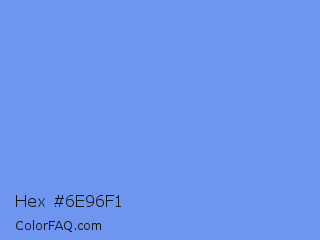 Hex #6e96f1 Color is a light blue color and the nearest color is Cornflower Blue #6495ed. Hex code #6e96f1 and RGB value is rgb(110,150,241). In RGB color space, this color is composed of 43% red, 59% green, 95% blue, In CMYK color space, this color is composed of 54% cyan, 38% magenta, 0% yellow , 5% black , In HSL color space, this color has a hue angle of 222° , 82% saturation and 69% lightness.