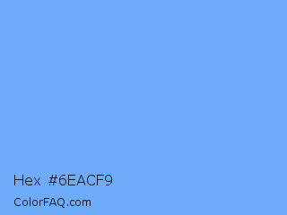 Hex #6eacf9 Color is a light blue color and the nearest color is French Sky Blue #77b5fe. Hex code #6eacf9 and RGB value is rgb(110,172,249). In RGB color space, this color is composed of 43% red, 67% green, 98% blue, In CMYK color space, this color is composed of 56% cyan, 31% magenta, 0% yellow , 2% black , In HSL color space, this color has a hue angle of 213° , 92% saturation and 70% lightness.