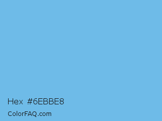 Hex #6ebbe8 Color is a light blue color and the nearest color is Aero #7cb9e8. Hex code #6ebbe8 and RGB value is rgb(110,187,232). In RGB color space, this color is composed of 43% red, 73% green, 91% blue, In CMYK color space, this color is composed of 53% cyan, 19% magenta, 0% yellow , 9% black , In HSL color space, this color has a hue angle of 202° , 73% saturation and 67% lightness.