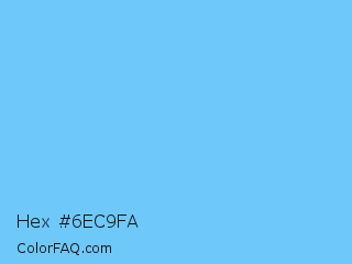 Hex #6ec9fa Color is a light blue color and the nearest color is Maya Blue #73c2fb. Hex code #6ec9fa and RGB value is rgb(110,201,250). In RGB color space, this color is composed of 43% red, 79% green, 98% blue, In CMYK color space, this color is composed of 56% cyan, 20% magenta, 0% yellow , 2% black , In HSL color space, this color has a hue angle of 201° , 93% saturation and 71% lightness.