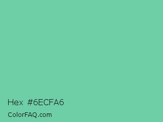 Hex #6ecfa6 Color is a light green color and the nearest color is Medium Aquamarine #66ddaa. Hex code #6ecfa6 and RGB value is rgb(110,207,166). In RGB color space, this color is composed of 43% red, 81% green, 65% blue, In CMYK color space, this color is composed of 47% cyan, 0% magenta, 20% yellow , 19% black , In HSL color space, this color has a hue angle of 155° , 50% saturation and 62% lightness.