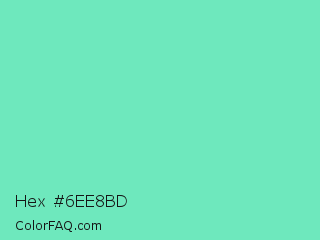 Hex #6ee8bd Color is a light green color and the nearest color is Medium Aquamarine #66ddaa. Hex code #6ee8bd and RGB value is rgb(110,232,189). In RGB color space, this color is composed of 43% red, 91% green, 74% blue, In CMYK color space, this color is composed of 53% cyan, 0% magenta, 19% yellow , 9% black , In HSL color space, this color has a hue angle of 159° , 73% saturation and 67% lightness.