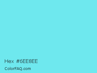 Hex #6ee8ee Color is a light cyan color and the nearest color is Spray #79deec. Hex code #6ee8ee and RGB value is rgb(110,232,238). In RGB color space, this color is composed of 43% red, 91% green, 93% blue, In CMYK color space, this color is composed of 54% cyan, 3% magenta, 0% yellow , 7% black , In HSL color space, this color has a hue angle of 183° , 79% saturation and 68% lightness.
