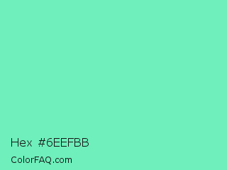Hex #6eefbb Color is a light green color and the nearest color is Medium Aquamarine #66ddaa. Hex code #6eefbb and RGB value is rgb(110,239,187). In RGB color space, this color is composed of 43% red, 94% green, 73% blue, In CMYK color space, this color is composed of 54% cyan, 0% magenta, 22% yellow , 6% black , In HSL color space, this color has a hue angle of 156° , 80% saturation and 68% lightness.