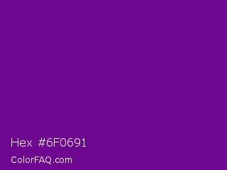 Hex #6f0691 Color is a dark purple color and the nearest color is Purple #660099. Hex code #6f0691 and RGB value is rgb(111,6,145). In RGB color space, this color is composed of 44% red, 2% green, 57% blue, In CMYK color space, this color is composed of 23% cyan, 96% magenta, 0% yellow , 43% black , In HSL color space, this color has a hue angle of 285° , 92% saturation and 30% lightness.
