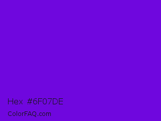 Hex #6f07de Color is a normal violet color and the nearest color is French Violet #8806ce. Hex code #6f07de and RGB value is rgb(111,7,222). In RGB color space, this color is composed of 44% red, 3% green, 87% blue, In CMYK color space, this color is composed of 50% cyan, 97% magenta, 0% yellow , 13% black , In HSL color space, this color has a hue angle of 269° , 94% saturation and 45% lightness.