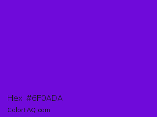 Hex #6f0ada Color is a normal violet color and the nearest color is French Violet #8806ce. Hex code #6f0ada and RGB value is rgb(111,10,218). In RGB color space, this color is composed of 44% red, 4% green, 85% blue, In CMYK color space, this color is composed of 49% cyan, 95% magenta, 0% yellow , 15% black , In HSL color space, this color has a hue angle of 269° , 91% saturation and 45% lightness.