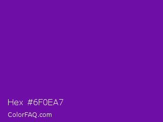 Hex #6f0ea7 Color is a normal purple color and the nearest color is Purple #660099. Hex code #6f0ea7 and RGB value is rgb(111,14,167). In RGB color space, this color is composed of 44% red, 5% green, 65% blue, In CMYK color space, this color is composed of 34% cyan, 92% magenta, 0% yellow , 35% black , In HSL color space, this color has a hue angle of 278° , 85% saturation and 35% lightness.