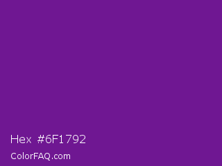 Hex #6f1792 Color is a normal purple color and the nearest color is Seance #731e8f. Hex code #6f1792 and RGB value is rgb(111,23,146). In RGB color space, this color is composed of 44% red, 9% green, 57% blue, In CMYK color space, this color is composed of 24% cyan, 84% magenta, 0% yellow , 43% black , In HSL color space, this color has a hue angle of 283° , 73% saturation and 33% lightness.