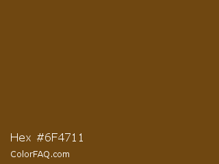 Hex #6f4711 Color is a dark orange color and the nearest color is Raw Umber #734a12. Hex code #6f4711 and RGB value is rgb(111,71,17). In RGB color space, this color is composed of 44% red, 28% green, 7% blue, In CMYK color space, this color is composed of 0% cyan, 36% magenta, 85% yellow , 56% black , In HSL color space, this color has a hue angle of 34° , 73% saturation and 25% lightness.