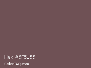 Hex #6f5155 Color is a normal red color and the nearest color is Ferra #704f50. Hex code #6f5155 and RGB value is rgb(111,81,85). In RGB color space, this color is composed of 44% red, 32% green, 33% blue, In CMYK color space, this color is composed of 0% cyan, 27% magenta, 23% yellow , 56% black , In HSL color space, this color has a hue angle of 352° , 16% saturation and 38% lightness.