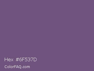 Hex #6f537d Color is a normal purple color and the nearest color is Dolphin #646077. Hex code #6f537d and RGB value is rgb(111,83,125). In RGB color space, this color is composed of 44% red, 33% green, 49% blue, In CMYK color space, this color is composed of 11% cyan, 34% magenta, 0% yellow , 51% black , In HSL color space, this color has a hue angle of 280° , 20% saturation and 41% lightness.