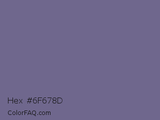 Hex #6f678d Color is a normal indigo color and the nearest color is Rum #796989. Hex code #6f678d and RGB value is rgb(111,103,141). In RGB color space, this color is composed of 44% red, 40% green, 55% blue, In CMYK color space, this color is composed of 21% cyan, 27% magenta, 0% yellow , 45% black , In HSL color space, this color has a hue angle of 253° , 16% saturation and 48% lightness.