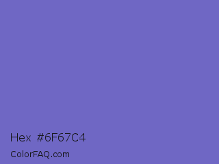 Hex #6f67c4 Color is a normal indigo color and the nearest color is Blue Marguerite #7666c6. Hex code #6f67c4 and RGB value is rgb(111,103,196). In RGB color space, this color is composed of 44% red, 40% green, 77% blue, In CMYK color space, this color is composed of 43% cyan, 47% magenta, 0% yellow , 23% black , In HSL color space, this color has a hue angle of 245° , 44% saturation and 59% lightness.