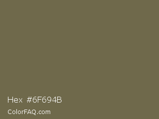Hex #6f694b Color is a normal yellow color and the nearest color is Go Ben #726d4e. Hex code #6f694b and RGB value is rgb(111,105,75). In RGB color space, this color is composed of 44% red, 41% green, 29% blue, In CMYK color space, this color is composed of 0% cyan, 5% magenta, 32% yellow , 56% black , In HSL color space, this color has a hue angle of 50° , 19% saturation and 36% lightness.