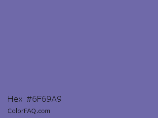 Hex #6f69a9 Color is a normal indigo color and the nearest color is Deluge #7563a8. Hex code #6f69a9 and RGB value is rgb(111,105,169). In RGB color space, this color is composed of 44% red, 41% green, 66% blue, In CMYK color space, this color is composed of 34% cyan, 38% magenta, 0% yellow , 34% black , In HSL color space, this color has a hue angle of 246° , 27% saturation and 54% lightness.