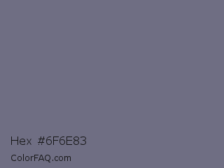 Hex #6f6e83 Color is a normal indigo color and the nearest color is Storm Gray #717486. Hex code #6f6e83 and RGB value is rgb(111,110,131). In RGB color space, this color is composed of 44% red, 43% green, 51% blue, In CMYK color space, this color is composed of 15% cyan, 16% magenta, 0% yellow , 49% black , In HSL color space, this color has a hue angle of 243° , 9% saturation and 47% lightness.