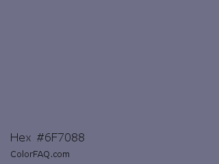 Hex #6f7088 Color is a normal blue color and the nearest color is Storm Gray #717486. Hex code #6f7088 and RGB value is rgb(111,112,136). In RGB color space, this color is composed of 44% red, 44% green, 53% blue, In CMYK color space, this color is composed of 18% cyan, 18% magenta, 0% yellow , 47% black , In HSL color space, this color has a hue angle of 238° , 10% saturation and 48% lightness.