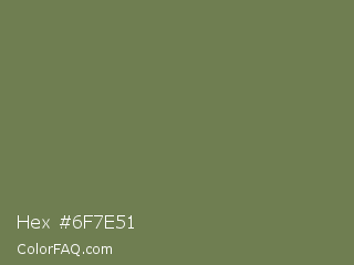 Hex #6f7e51 Color is a normal green color and the nearest color is Go Ben #726d4e. Hex code #6f7e51 and RGB value is rgb(111,126,81). In RGB color space, this color is composed of 44% red, 49% green, 32% blue, In CMYK color space, this color is composed of 12% cyan, 0% magenta, 36% yellow , 51% black , In HSL color space, this color has a hue angle of 80° , 22% saturation and 41% lightness.