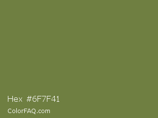 Hex #6f7f41 Color is a normal lime color and the nearest color is Dingley #5d7747. Hex code #6f7f41 and RGB value is rgb(111,127,65). In RGB color space, this color is composed of 44% red, 50% green, 25% blue, In CMYK color space, this color is composed of 13% cyan, 0% magenta, 49% yellow , 50% black , In HSL color space, this color has a hue angle of 75° , 32% saturation and 38% lightness.