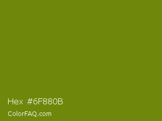 Hex #6f880b Color is a dark lime color and the nearest color is Trendy Green #7c881a. Hex code #6f880b and RGB value is rgb(111,136,11). In RGB color space, this color is composed of 44% red, 53% green, 4% blue, In CMYK color space, this color is composed of 18% cyan, 0% magenta, 92% yellow , 47% black , In HSL color space, this color has a hue angle of 72° , 85% saturation and 29% lightness.