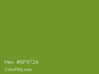 Hex #6f972a Color is a normal green color and the nearest color is Olive Drab #6b8e23. Hex code #6f972a and RGB value is rgb(111,151,42). In RGB color space, this color is composed of 44% red, 59% green, 16% blue, In CMYK color space, this color is composed of 26% cyan, 0% magenta, 72% yellow , 41% black , In HSL color space, this color has a hue angle of 82° , 56% saturation and 38% lightness.