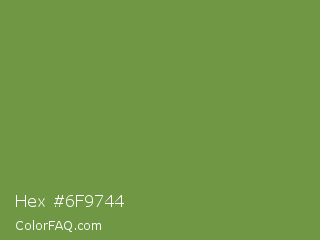 Hex #6f9744 Color is a normal green color and the nearest color is Palm Leaf #6f9940. Hex code #6f9744 and RGB value is rgb(111,151,68). In RGB color space, this color is composed of 44% red, 59% green, 27% blue, In CMYK color space, this color is composed of 26% cyan, 0% magenta, 55% yellow , 41% black , In HSL color space, this color has a hue angle of 89° , 38% saturation and 43% lightness.