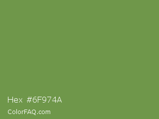 Hex #6f974a Color is a normal green color and the nearest color is Palm Leaf #6f9940. Hex code #6f974a and RGB value is rgb(111,151,74). In RGB color space, this color is composed of 44% red, 59% green, 29% blue, In CMYK color space, this color is composed of 26% cyan, 0% magenta, 51% yellow , 41% black , In HSL color space, this color has a hue angle of 91° , 34% saturation and 44% lightness.