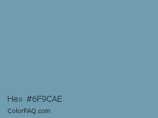 Hex #6f9cae Color is a normal blue color and the nearest color is Weldon Blue #7c98ab. Hex code #6f9cae and RGB value is rgb(111,156,174). In RGB color space, this color is composed of 44% red, 61% green, 68% blue, In CMYK color space, this color is composed of 36% cyan, 10% magenta, 0% yellow , 32% black , In HSL color space, this color has a hue angle of 197° , 28% saturation and 56% lightness.