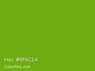 Hex #6fac14 Color is a normal green color and the nearest color is Christi #67a712. Hex code #6fac14 and RGB value is rgb(111,172,20). In RGB color space, this color is composed of 44% red, 67% green, 8% blue, In CMYK color space, this color is composed of 35% cyan, 0% magenta, 88% yellow , 33% black , In HSL color space, this color has a hue angle of 84° , 79% saturation and 38% lightness.