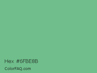 Hex #6fbe8b Color is a normal green color and the nearest color is De York #7ac488. Hex code #6fbe8b and RGB value is rgb(111,190,139). In RGB color space, this color is composed of 44% red, 75% green, 55% blue, In CMYK color space, this color is composed of 42% cyan, 0% magenta, 27% yellow , 25% black , In HSL color space, this color has a hue angle of 141° , 38% saturation and 59% lightness.