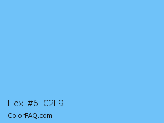 Hex #6fc2f9 Color is a light blue color and the nearest color is Maya Blue #73c2fb. Hex code #6fc2f9 and RGB value is rgb(111,194,249). In RGB color space, this color is composed of 44% red, 76% green, 98% blue, In CMYK color space, this color is composed of 55% cyan, 22% magenta, 0% yellow , 2% black , In HSL color space, this color has a hue angle of 204° , 92% saturation and 71% lightness.