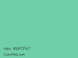 Hex #6fcfa7 Color is a light green color and the nearest color is Medium Aquamarine #66ddaa. Hex code #6fcfa7 and RGB value is rgb(111,207,167). In RGB color space, this color is composed of 44% red, 81% green, 65% blue, In CMYK color space, this color is composed of 46% cyan, 0% magenta, 19% yellow , 19% black , In HSL color space, this color has a hue angle of 155° , 50% saturation and 62% lightness.