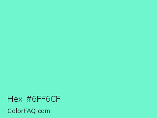 Hex #6ff6cf Color is a light green color and the nearest color is Aquamarine #7fffd4. Hex code #6ff6cf and RGB value is rgb(111,246,207). In RGB color space, this color is composed of 44% red, 96% green, 81% blue, In CMYK color space, this color is composed of 55% cyan, 0% magenta, 16% yellow , 4% black , In HSL color space, this color has a hue angle of 163° , 88% saturation and 70% lightness.