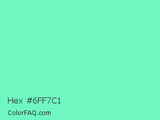 Hex #6ff7c1 Color is a light green color and the nearest color is Aquamarine #7fffd4. Hex code #6ff7c1 and RGB value is rgb(111,247,193). In RGB color space, this color is composed of 44% red, 97% green, 76% blue, In CMYK color space, this color is composed of 55% cyan, 0% magenta, 22% yellow , 3% black , In HSL color space, this color has a hue angle of 156° , 89% saturation and 70% lightness.