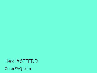 Hex #6fffdd Color is a light cyan color and the nearest color is Aquamarine #7fffd4. Hex code #6fffdd and RGB value is rgb(111,255,221). In RGB color space, this color is composed of 44% red, 100% green, 87% blue, In CMYK color space, this color is composed of 56% cyan, 0% magenta, 13% yellow , 0% black , In HSL color space, this color has a hue angle of 166° , 100% saturation and 72% lightness.